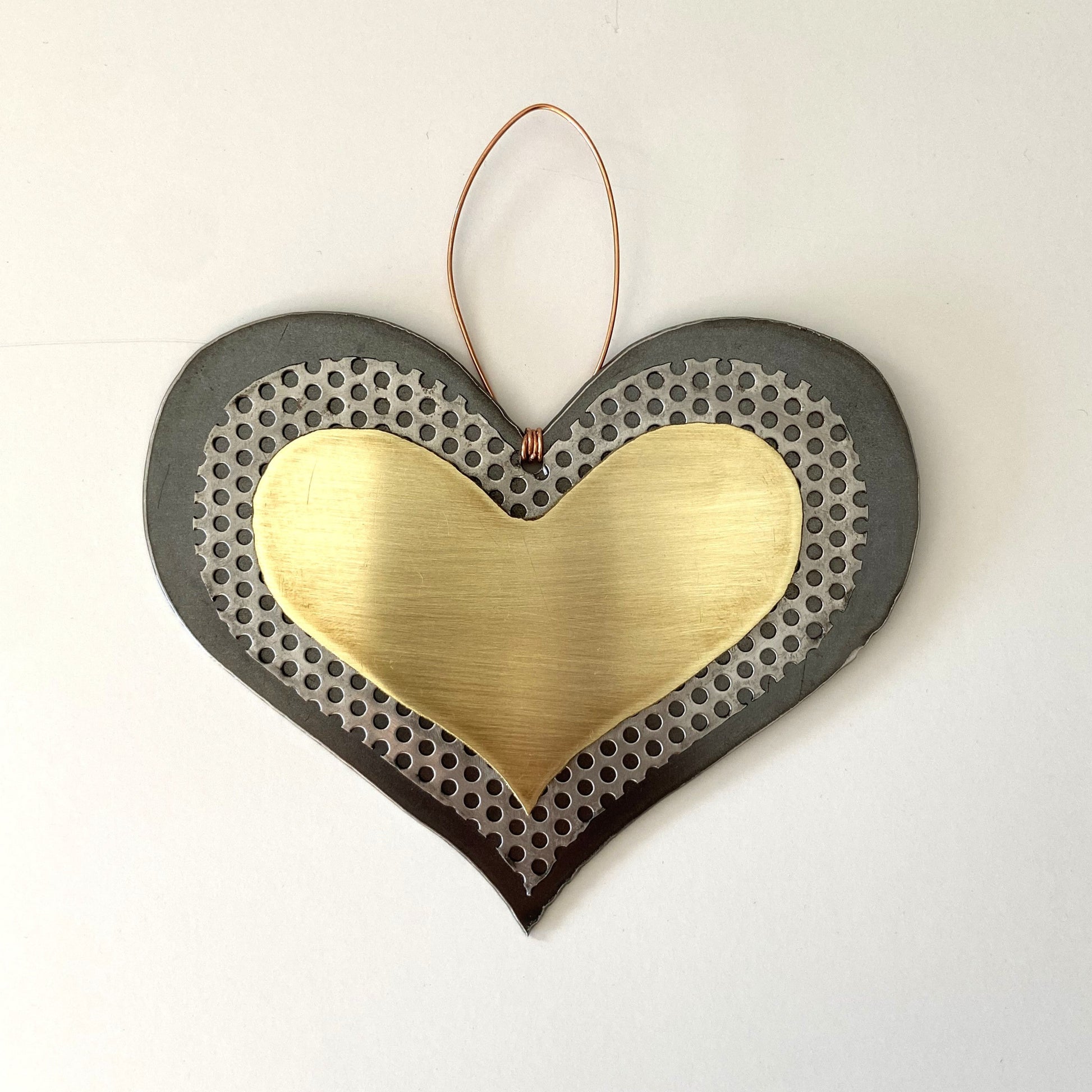 Add warmth and meaning to your space with this handcrafted mixed metal heart ornament, made from recycled brass, steel, and perforated metal. Its layered, three-dimensional design brings depth and texture, creating a perfect blend of industrial strength and romantic artistry.